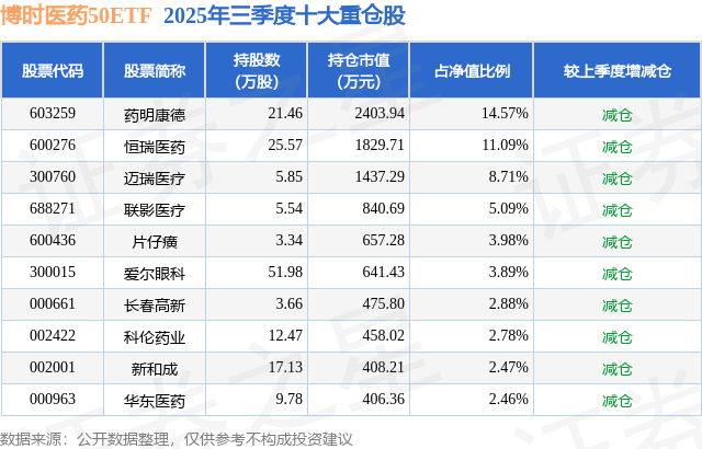 从基金规模来看,博时医药50ETF基金2025年三季度公布的基金规模为1.65亿元,较上一期规模1.93亿元变化了-2826.9万元,环比变化了-14.63%。该基金最新一期钞票确立为:股票占净值比97.35%,无债券类钞票,现款占净值比2.89%。从基金合手仓来看,该基金当季前十大股票仓位达57.92%,第一大重仓股为药明康德(603259),合手仓占比为14.57%。