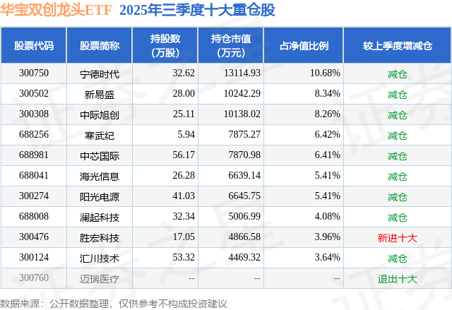 从基金边界来看,华宝双创龙头ETF基金2025年三季度公布的基金边界为12.27亿元,较上一期边界11.15亿元变化了1.12亿元,环比变化了10.04%。该基金最新一期财富成立为:股票占净值比99.28%,无债券类财富,现款占净值比0.74%。从基金持仓来看,该基金当季前十大股票仓位达62.61%,第一大重仓股为宁德时期(300750),持仓占比为10.68%。